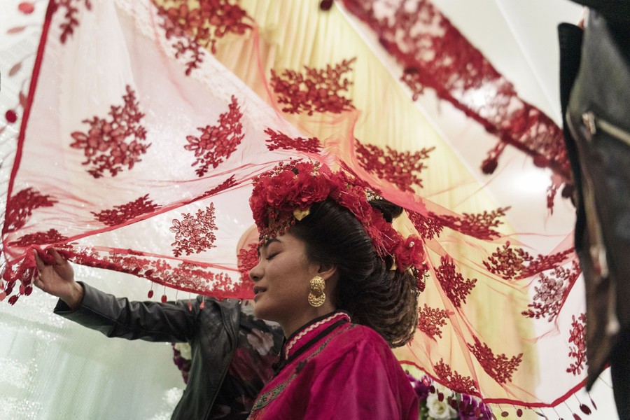 Read moreDungan Wedding. Finalist, People. Madina, 20, an ethnic Dungan, is covered by a red veil before she leaves for the groom’s house during a wedding ceremony in Milyanfan, Kyrgyzstan. Dungans wear traditional Chinese-influenced wedding gowns, follow traditional Hui Chinese wedding ceremonies from the 19th century, and practice endogamy, but due to shrinking population size, they have stopped the practice and allowed Dungans to marry other ethnicities. #