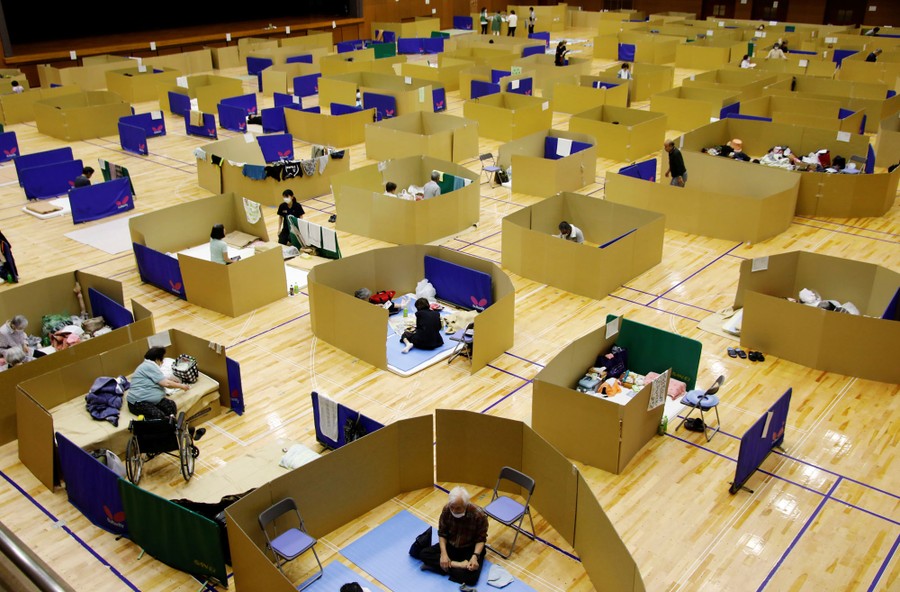 Read morePeople rest at a temporary evacuation center using cardboard to maintain social distancing amid the coronavirus outbreak, at a gymnasium in Yatsushiro, on July 7, 2020. #