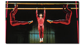 rebounding, zinging among two tall towers, a set of high-wire parallel bars, an