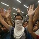 Demonstrators, some of whom have never heard of Ferguson, show their peaceful intentions with their palms.
