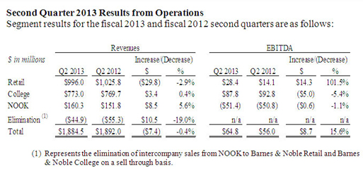 We've become conditioned to hearing about how the Nook will help keep Barnes & Noble's hemorrhaging physical stores afloat, but the present reality seems to be just the opposite — now it's the Nook that's dragging the company's more stable brick & mortar operation down. Total sales increases and decreases only take a snapshot of a business' health. A better indicator of profitability is EBITDA, which measures earnings before interest, taxes, and other factors. As you can see in the graph below, even though B&N's retail side slipped on earnings, their EBITDA rose by 7.3 percent. In the previous quarter, their retail-side EBITDA shot up by over 100 percent. The Nook segment, on the other hand, fell by almost 130 percent this quarter: