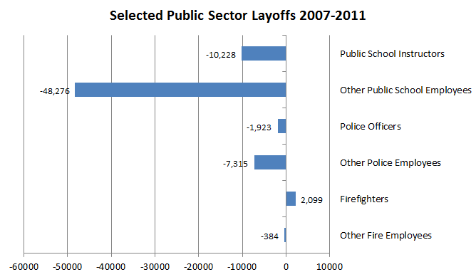 It's not just schools following this firing pattern. Police departments have fired fewer officers than administrative staffers. Fire departments have added firefighters and cut other employees. So when it comes to essential functions, state and local governments appear to have focused cuts on the administrative end, while keeping as many employees around as possible to provide services.