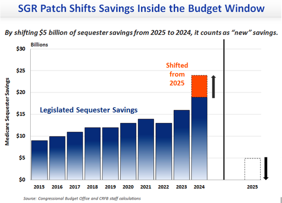 Under current law, a mandatory sequestration imposes a two percent annual cut to Medicare providers through calendar year 2024. But savings in the second half of the calendar year don’t appear in the budget until fiscal year 2025.To pay for $5 billion of the recently-passed “Doc Fix,” policymakers doubled the provider cut from 2 percent to 4 percent in the first half of 2024, but cut it to 0% in the second half.