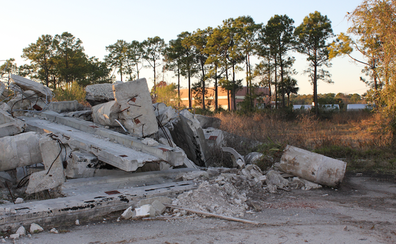 In 2007, the remains of the mill were blown up, despite some local efforts to retain and reuse them as startup sites, light-industrial buildings, or even monuments. That left what is now a rubble-filled "brownfield" between the city's historic downtown and the coastal marsh. Here is a video of the demolition (in the last few minutes of the clip), with others here and here.