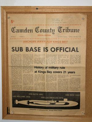 That big news of January, 1978, is memorialized in a front page shown in the local Submarine Museum (at right). Everything about the city was changed by the Navy's arrival. In Gilman's heyday, its manager had claimed that 75 percent of the people in the county owed their living directly to the mill. A few weeks ago in St. Marys, local officials told us that perhaps 70 percent of the regional economy was now related to the base -- a figure that includes rental housing, retail, construction, and the other spillover effects of growth itself.