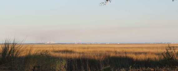 That was then. Largely through mismanagement and the side effects of family squabbles, Gilman went through a long decline. You can read some of the details in this Forbes account, but overall it was a depressing personal and business saga. (Some other, better run plants still operate in the vicinity -- you can just glimpse them in the distance in this shot below, from the former Gilman property across the wetlands toward the coast.) Gilman had been the largest privately owned paper mill in America, but 15 years ago the family sold it to a Mexican firm, and not long afterwards that firm closed the mill, eliminating some 900 jobs.