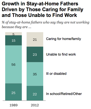 That’s a somewhat positive storyline, but these dads’ reasons for being at home aren’t as uplifting. There has been a big jump in the number of fathers who say they’re at home primarily to take care of their families— it’s now 21 percent, compared to 5 percent in 1989. But Pew adds:
