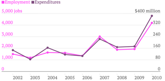 Even during the recession, Hawaii’s film and TV industry grew. While Hawaii lost a net 0.7 percent of its jobs from 2007-2011, the film and TV industry grew 7.6 percent over the same period. Not only was it largely recession-proof, but it performed far better than the national average of the same industry. With all that growth, Hawaii’s creative sector generated $3.8 billion in economic activity in 2011, good for 6 percent of state GDP that year.