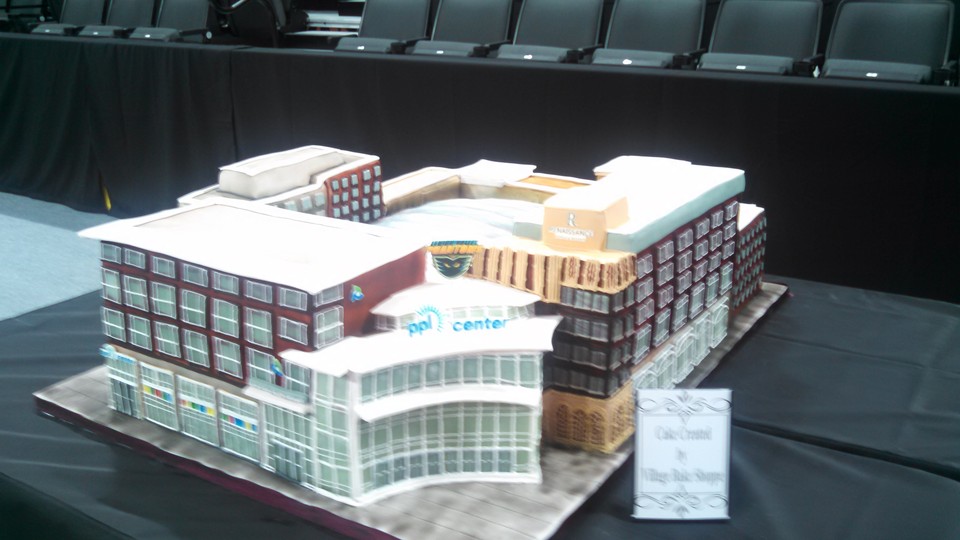 A 500-pound cake, inside the arena it depicts (Village Bake Shoppe)