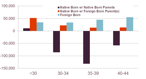 The Harvard study found that second-generation immigrants accounted for the largest share of growth in households headed up by the under-30 crowd during the last 20 years. (The second largest share of growth belongs to immigrants.) In the near future that growth could be even more significant. “Looking forward, we expect that second-generation growth originating from the higher immigration levels of the 1990s and early 2000s will be even larger,” the report said. “The children of immigrants are part of the immigrant package, they're the ones who are consuming services," says Myers. "You get a big payoff later on, and one of the payoffs is that they fortify the housing market.”