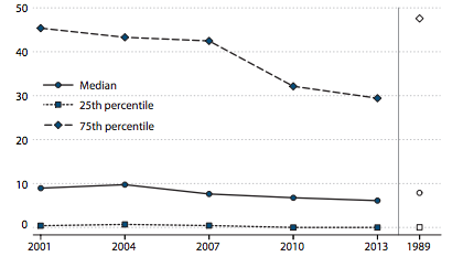 And the losses of the recession may have decreased the gap between the wealthiest young Americans and middle-class Millennials. In 2001, the net worth of young Americans in the 75th percentile was $45,400. By 2013, net worth for Millennials in the same group was only $29,400. Median net worth for young Americans between the ages of 18 and 31 didn’t drop as much during that period: $8,900 in 2001 and $6,100 in 2013, shrinking the gap between the wealthiest young Americans and middle-class Americans from about about 5.1 times as high to around 4.8.
