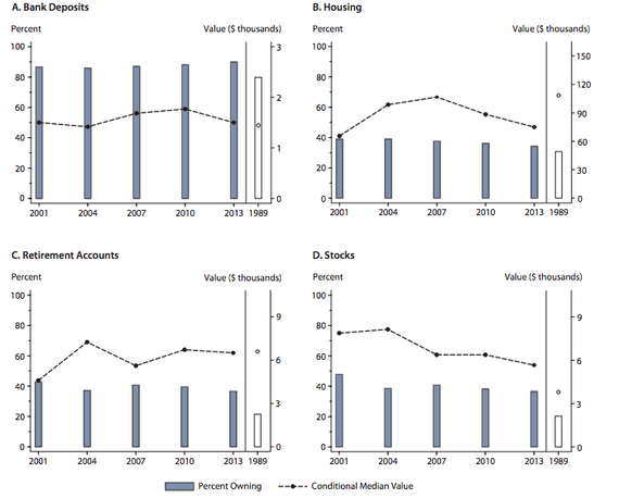 For those who have been able to find employment and housing that they can afford, the recession and the wage stagnation that has characterized the recovery may not have created that glum of a long-term financial picture. “Compared with young adults in 1989, young adults in 2013 were more likely to own homes, stocks, and retirement accounts. Moreover, young adults in 2013 were less likely to have high debt payment burdens than older adults, young adults in 1989, and young adults in 2001,” the study found. And the median value of bank accounts, retirement portfolios, and stocks held by young Americans were equal or higher than the value of the same holdings for young Americans in 1989.
