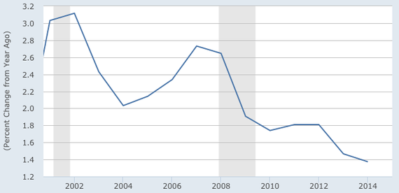 The deceleration of healthcare employment matches the slowdown in medical costs. After a roller-coaster ride through the last quarter of the 20th century, healthcare inflation looks like it's pumping the brakes to park near the 2 percent line, the lowest mark since the year Medicare and Medicaid were signed into law: 1965.
