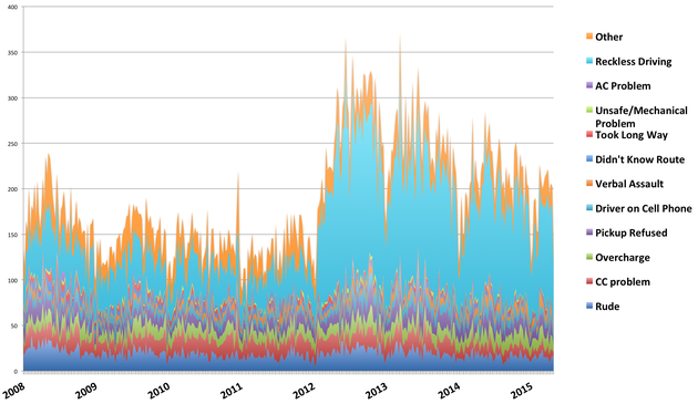 Unlike New York, Chicago collects data not just on complaints, but on the nature of the complaint. As the total number of complaints has fallen since 2012, as one would expect given the falling number of taxi rides, so have the types of complaints that one would expect if drivers were making an effort to offer better customer service. In particular, complaints about messy cabs and talking on cell phones fell as a share of total complaints in Chicago. Complaints about cab climate and “broken” credit-card readers, which can be controlled by drivers and the companies that maintain the cabs, also decreased as a share of the total. (The spike in complaints in 2012 can be chalked up to a new rule requiring taxis to display a bumper sticker that read “How’s my driving? Compliments or Concerns, Call 311.”)