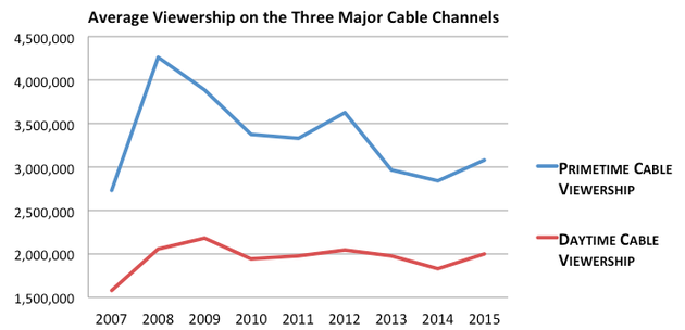 Taking a longer view, cable is still in structural decline. Last year was a huge triumph for cable profits, but less so for cable ratings. Primetime and daytime cable viewership for the three cable news networks only clawed back to their 2013 levels, well below their highs in 2008 and 2009.