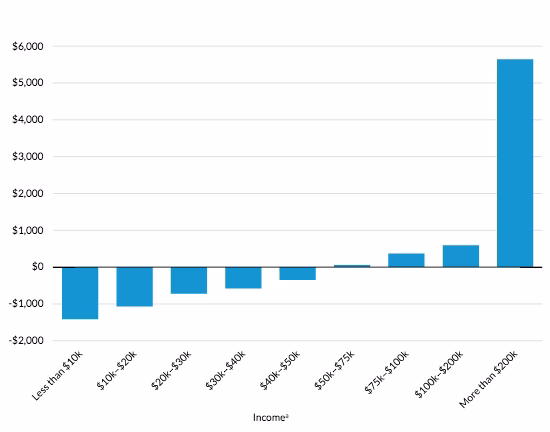 According to TPC analysis, households making less than $20,000 would lose at least $1,000 in benefits, on average. Households making more than $1 million would keep an extra $51,000 in post-tax income, on average. In other words: Under this bill, the median household would lose money, and millionaires would add the income-equivalent of a median household.