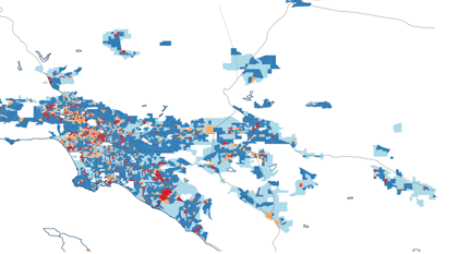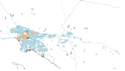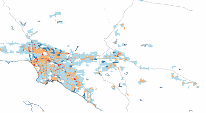 But in the 21st century, the pattern changes dramatically. Now the great bulk of the map is dark blue—vast swaths of no construction. More than half of L.A.’s built-up areas have hosted no new housing construction this decade. While most urban theorists complain about land-use restrictions in the urban core, and urban NIMBYs, there are considerable areas of red and orange in downtown L.A., Hollywood, and large parts of the Westside and the San Fernando Valley. The areas with no new housing tend to envelop large swaths of older, closer-in suburbs. From this map, restrictive land-use policies and NIMBYism appear to be more a problem of the old crabgrass suburbs than of the inner city.