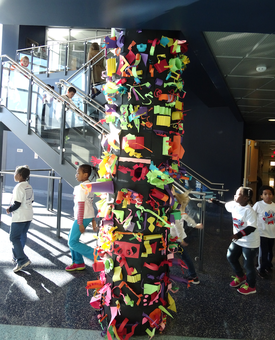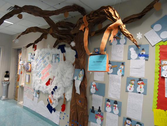 On the other hand, there is no shortage of art in the rest of the school. Corridor walls are bursting with 3-D extravaganzas. Children have created all manner of décor. There are paper trees growing out of walls, fluffy snowmen popping out, suspended robots and all manner of things that protrude and hang and dangle.