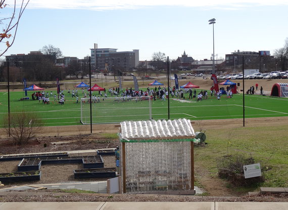 The recycled-bottle greenhouse and garden in foreground. A field day of running races in background.