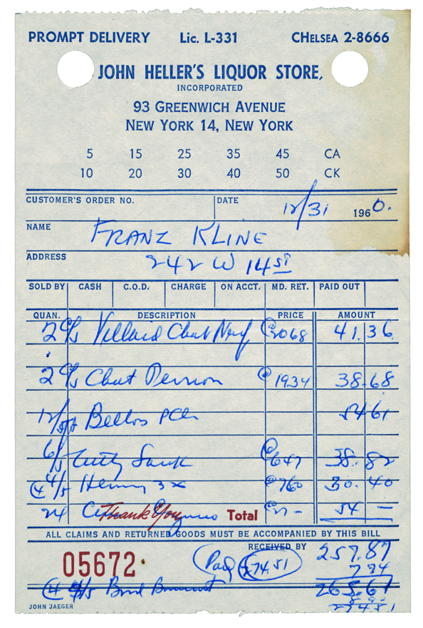 Franz Kline's receipt from John Heller's Liquor Store, Dec. 31, 1960. Elisabeth Zogbaum papers regarding Franz Kline, 1928-1965.