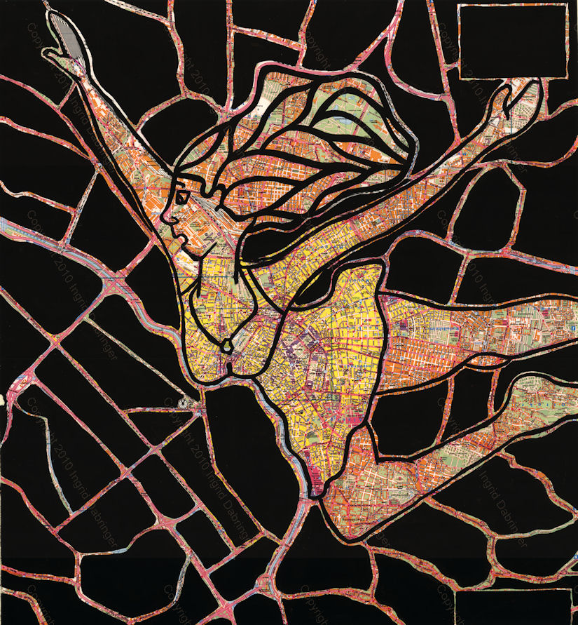 As a hopeless lover of maps, creative cartography and, especially, maps as art, I was utterly enchanted by the work of mixed-media visual artist Ingrid Dabringer, who uses acrylic paint to draw—or, more precisely, find—extraordinary, playful characters and vignettes in ordinary maps.