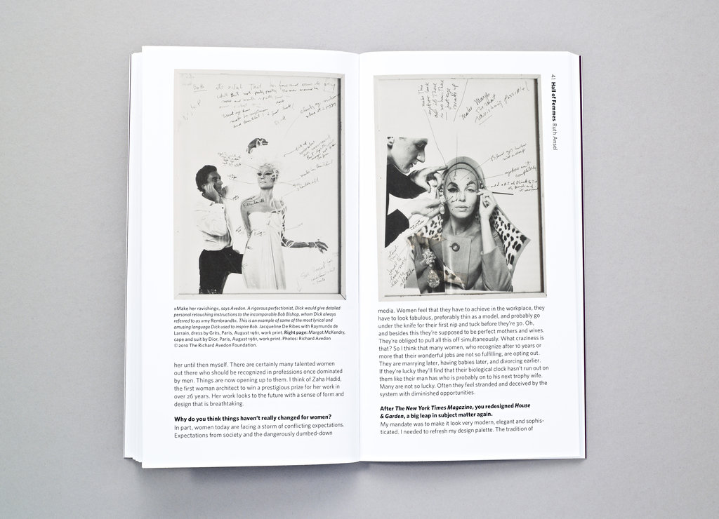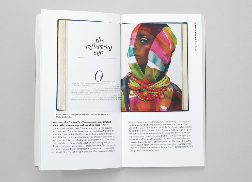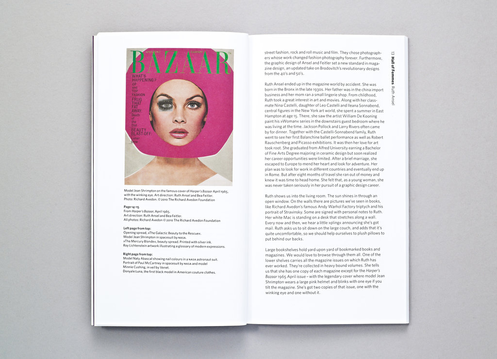 Hall of Femmes: Ruth Ansel highlights one of the greatest magazine designers of all time, who over the past half-century has been shaping the visual aesthetic of some of the most influential magazines of our time as a visionary art director -- Harper's Bazaar in the 1960s, The New York Times Magazine in the 1970s, Vanity Fair in the 1980s, and running her own design studio since the 1990s. She has collaborated with nearly every icon of magazine publishing -- Diana Vreeland, Richard Avedon, Annie Leibowitz, Bruce Weber, Tina Brown, and many more.In her 70s, answer remains active and creatively restless as ever.