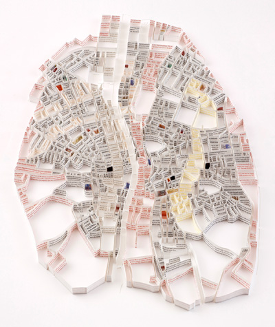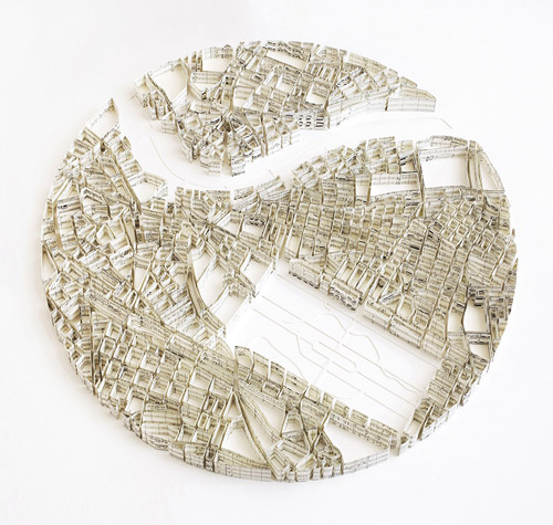 As a hopeless lover of maps and cities, and even more so of books about maps and books about cities, I was instantly enthralled by the work of Oregon-based British artist Matthew Picton, whose stunning paper sculptures of cities are made of books and other textual materials related to the respective city, taking the art of book sculpture to whole new level of meta with subtle, thoughtful commentary through the selection of the specific texts.