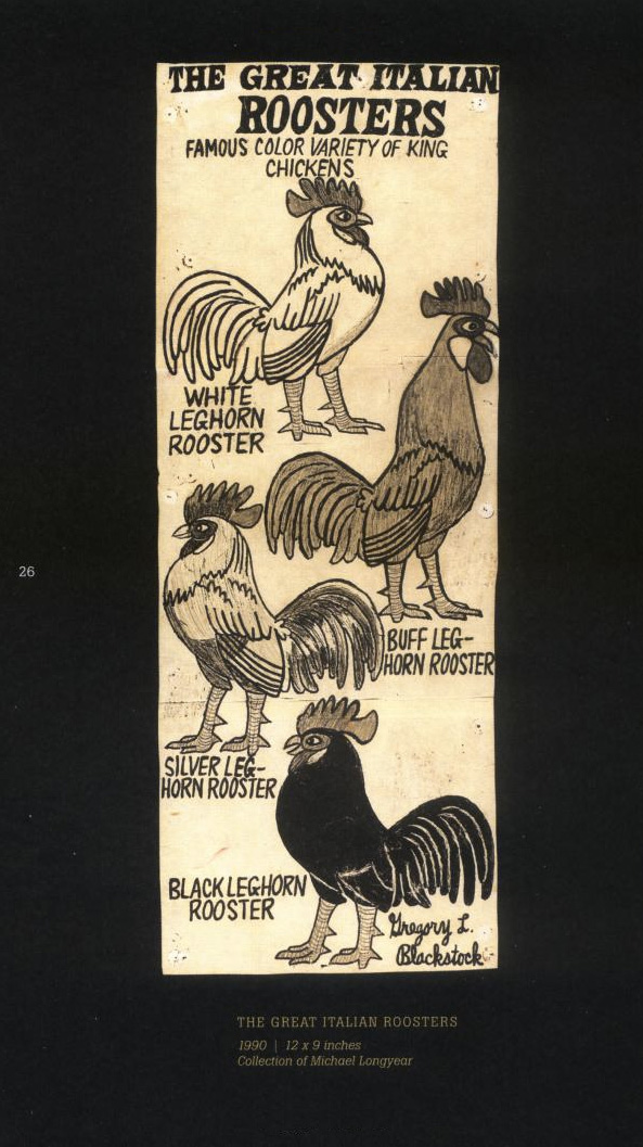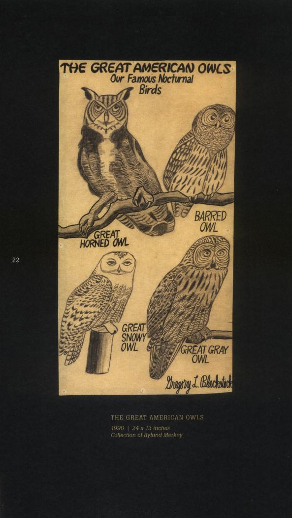 He has been called an "anthropologist of the everyday," a beacon of Outsider Art. His work is part Lists, part Drawing Autism, part Pictorial Webster's, part something entirely its own and entirely remarkable. Seattle-based artist Gregory Blackstock is an autistic savant who, after retiring from a lifetime as a pot washer at the age of 58, captivated the art world with the obsessive, meticulous drawings he'd been making over 18 years of after-hours. Blackstock's Collections, the brainchild of Karen Light-Piña of Garde Rail Gallery, who discovered Blackstock in 2003, catalogs his astounding visual lists of everything from hats to owl varieties, made with a pencil, a black marker, some crayons, and superhuman attention to detail.