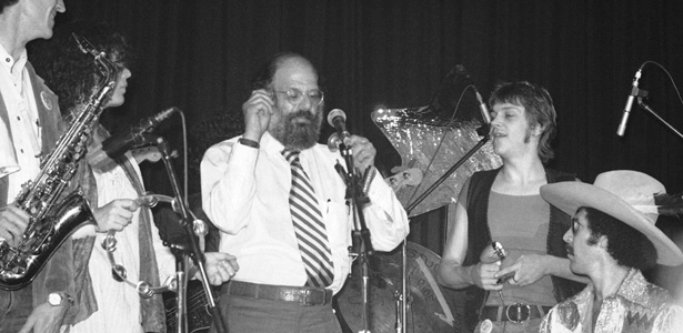 Poet Allen Ginsburg jams with the Kinky Friedman Band at a 1978 rally for Abbie Hoffman. AP Images