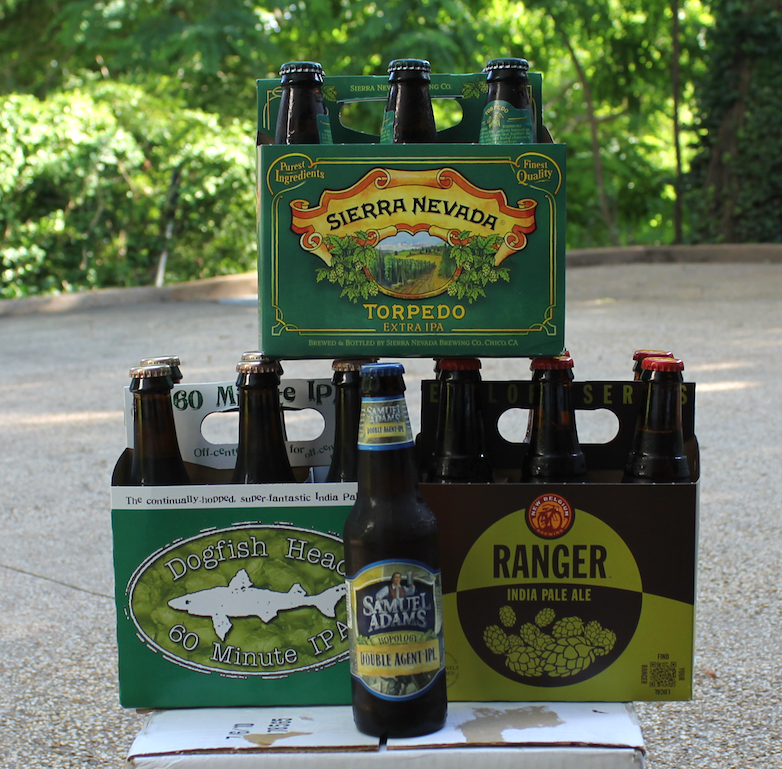 The out-of-focus bottle at the bottom center is worth noting, alongside the familiar stalwarts in their six-packs. It's the new "Double Agent IPL" from Boston Brewing / Sam Adams. Here is what the label would look like if it were in focus: