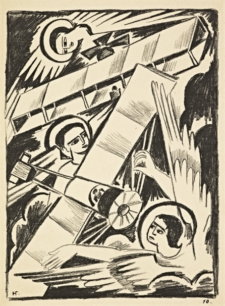 Meanwhile, a generation of traumatized artists on both sides made art that was poignant, cautionary, and incendiary. The work of those who rebelled is examined in the books complementing both exhibitions: The Getty’s Nothing But the Clouds Unchanged: Artists in World War I (edited by Hughes and Philipp Blom) and the Wolfonian’s Myth + Machine: Art and Aviation in the First World War (written by Jon Mogul and Peter Clericuzio).