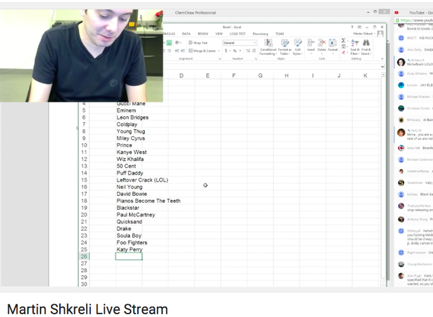 Breaking: On the livestream, he’s started a list of bands he’d hire to make “a record that I would pay the artist to release that would be just for me.”