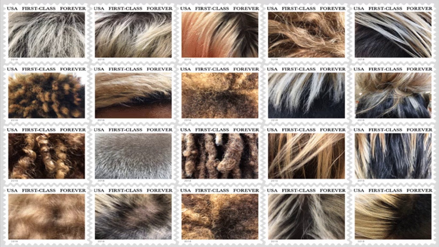 Though the artists didn’t ask subjects to identify their race or ethnicity, Stamped features interviews with people from an array of backgrounds. Along with audio from on-the-ground conversations and ingredient lists for blond hair dye marking the gallery’s windows, the exhibit displays photographs, some shrunken to fit onto real postage stamps.These images offer close-ups of bleached-blond hair, often sharply contrasting with the wearer’s darker roots growing through.