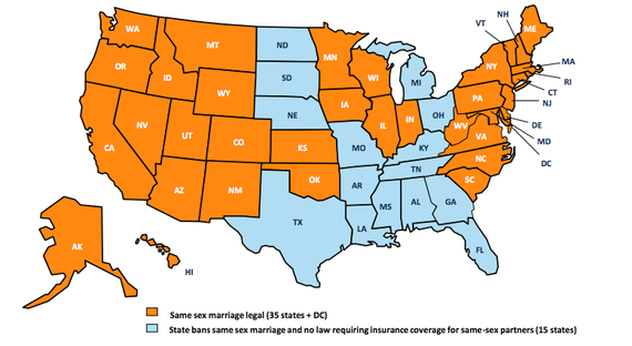 Fifteen states have no law requiring insurance coverage for same-sex partners, and in those states, businesses can choose not to offer same-sex spousal health coverage. Massachusetts is not one of those states, however: According to the Kaiser Family Foundation, in the 37 states with legal gay marriage, “employees’ same-sex spouses should have the same eligibility as opposite-sex spouses for dependent health coverage.” The U.S. Supreme Court ruled in June that states that recognize same-sex marriage must also treat gay spouses the same as straight spouses when it comes to federal benefits and taxes.