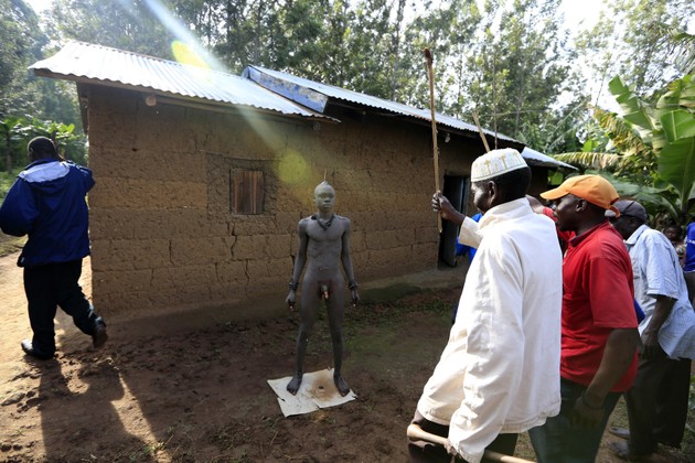 A father salutes his son, who just underwent circumcision, outside a house in Kenya's western region of Bungoma on August 9, 2014. Circumcision rituals, which take place in August, are celebrated amongst some Kenyan tribes as an annual rite of passage into adulthood. The Bukusu group, a sub-tribe of the Luhya tribe that is one of the largest in Kenya, is one community to continue the tradition. The day before the ceremony, the boy's uncle slaughters a cow and dresses him in a chunk of the meat as a personal gift and as permission for him to proceed with the circumcision. The boys, aged 16 and under, bathe in the river to numb their bodies before the ritual, which they must undergo without flinching. (Noor Khamis / Reuters)