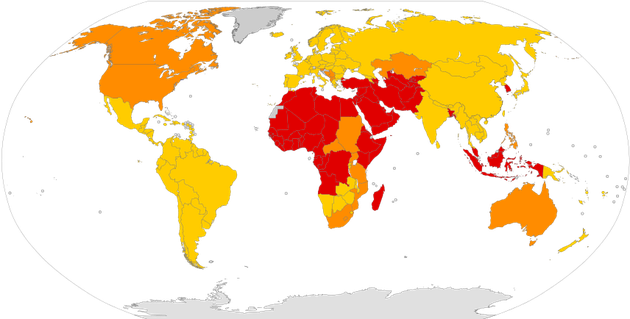 Map via Wikipedia: “Male circumcision rate by country according to the World Health Organization's 2007 review of the global trends and determinants of prevalence, safety, and acceptability of circumcision [9].” Red countries show >80% prevalence, orange 20-80%, and yellow <20%.