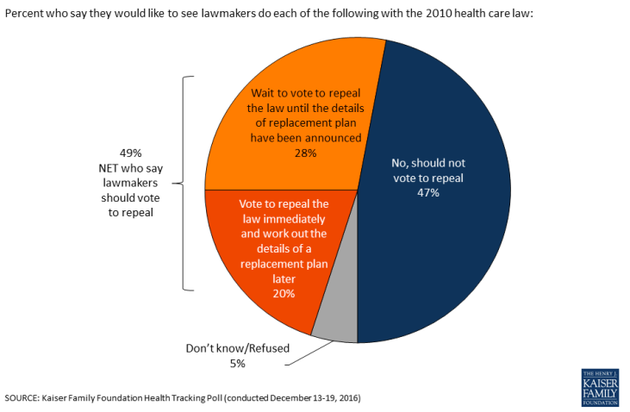 Still, the majority of people who are actually on Obamacare plans or Medicaid are satisfied with their coverage, according to the Commonwealth Fund, and only 20 percent of survey respondents told the Kaiser Family Foundation they want the law repealed before the details of a replacement are made clear. In other words, the people who benefit from Obamacare are happy with it, and Americans’ zeal for wantonly scrapping the law, if it ever was fervent, seems to have dampened.