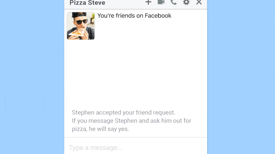 For example, “Stephen accepted your friend request. Tell him what your favorite type of pizza is.”