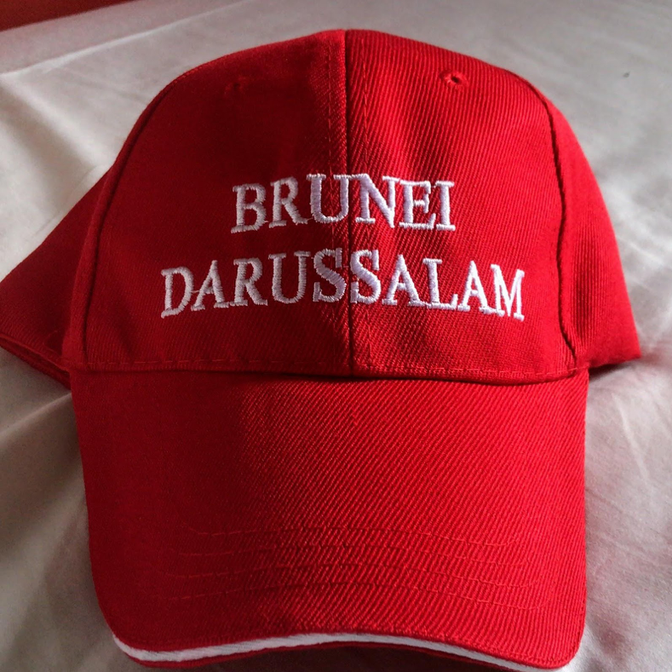 In the gift shop at the sultan’s museum I found a baseball cap, fire-engine red, with white lettering in a familiar font but without the words I was expecting: