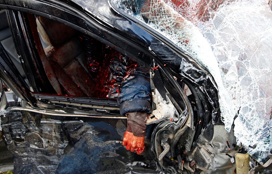 Click to view imageRead moreThe bloodied arm of a fighter loyal to Libyan leader Muammar Qaddafi hangs out of a damaged vehicle in Benghazi after he was killed by rebel fighters, March 19, 2011. #