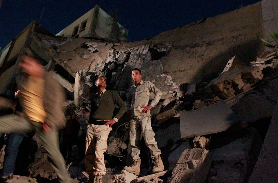 Read moreLibyan soldiers survey the damage to an administrative building hit by a missile late Sunday in the heart of Muammar Qaddafi's Bab Al Azizia compound in Tripoli, Libya, early Monday, March 21, 2011 as they are pictured during an organized trip by the Libyan authorities. #