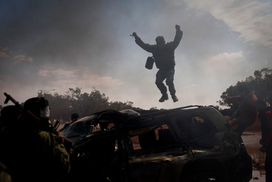 Read moreA Libyan rebel jumps on top of a still-burning car after Libyan leader Muammar Qaddafi's forces where pushed back from Benghazi, eastern Libya, Saturday, March 19, 2011. #