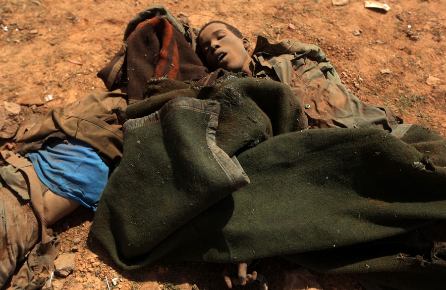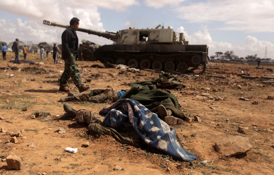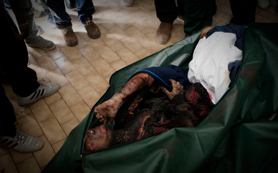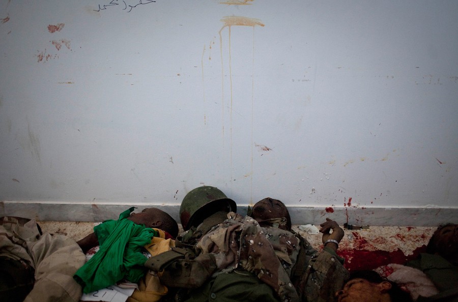 Click to view imageRead moreThe dead bodies of teenage African members of Muammar Qaddafi's forces lie among debris in al-Wayfiyah, west of Benghazi, after being hit by French warplanes on March 20, 2011. #
