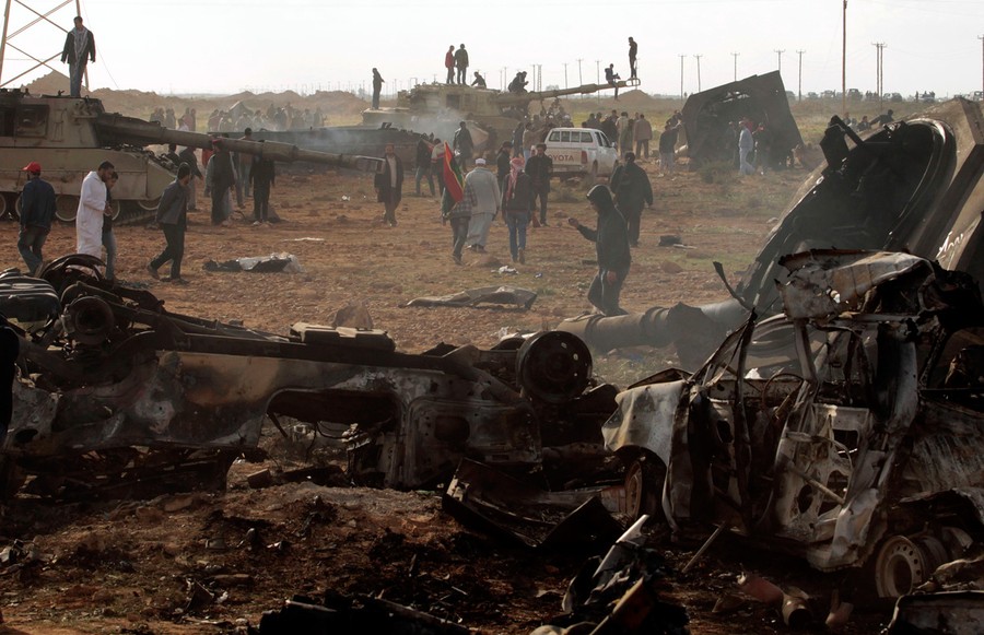 Read morePeople look at destroyed tanks belonging to forces loyal to Libyan leader Muammar Qaddafi after an air strike by coalition forces between Benghazi and Ajdabiyah on March 20, 2011. #
