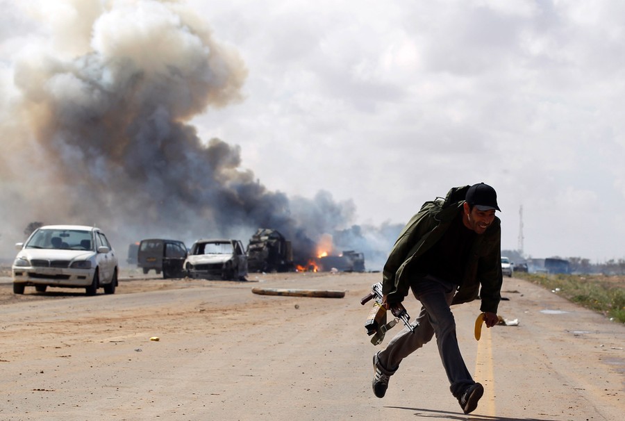 Read moreA rebel fighter runs for cover in front of vehicles belonging to forces loyal to Libyan leader Muammar Qaddafi after an air strike by coalition forces, along a road between Benghazi and Ajdabiyah March 20, 2011. #