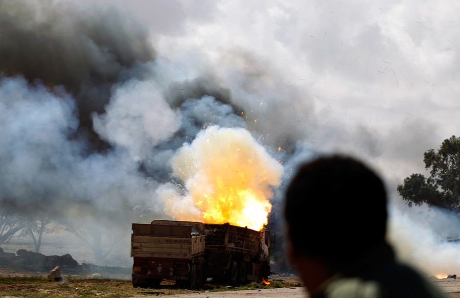 Read moreVehicles belonging to forces loyal to Libyan leader Muammar Qaddafi explode after an air strike by coalition forces, along a road between Benghazi and Ajdabiyah March 20, 2011. #