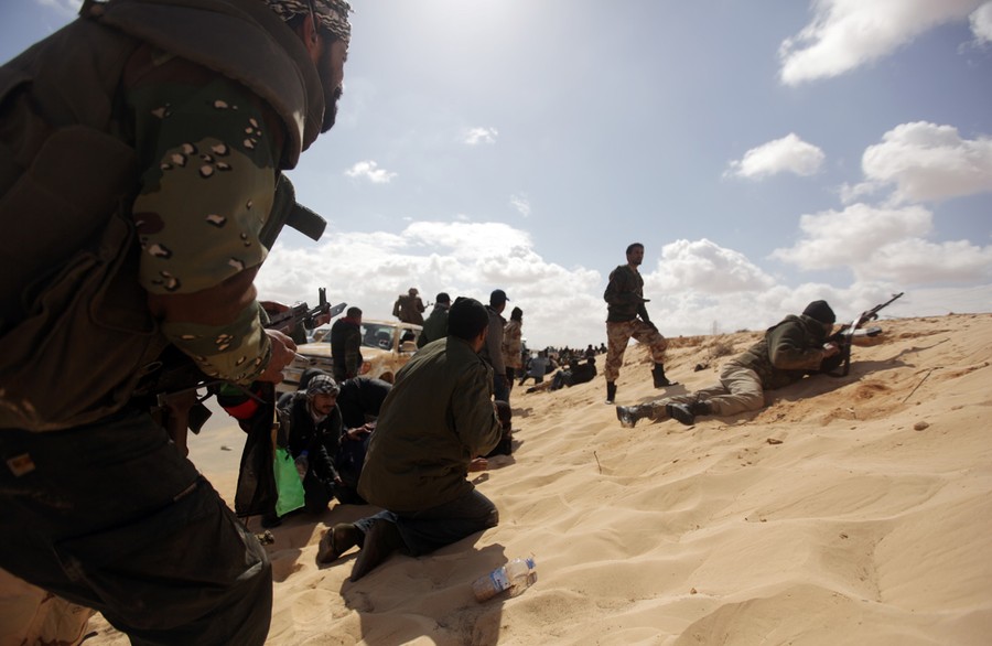 Read moreLibyan rebels duck for cover during a failed attempt to take the town of Ajdabiya from Muammar Qaddafi's forces on March 21, 2011 as news reports said Libyan government forces pulled back 100 kilometers (60 miles) from rebel-held Benghazi but showed they still had plenty of fight as they beat off an insurgent advance. #