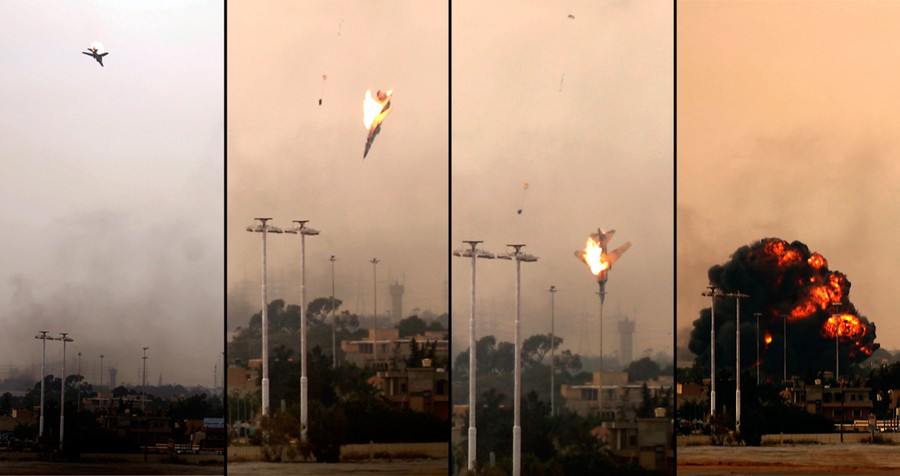 Read moreA Libyan jet bomber crashes after being hit over Benghazi on March 19, 2011 as Libya's rebel stronghold came under attack, with at least two air strikes and sustained shelling of the city's south sending thick smoke into the sky. There were conflicting reports about who was flying the plane and who shot it down. #