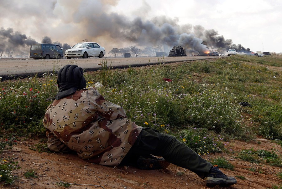Read moreA rebel fighter lies on the side of a road, watching burning vehicles belonging to forces loyal to Libyan leader Muammar Qaddafi between Benghazi and Ajdabiyah March 20, 2011. #
