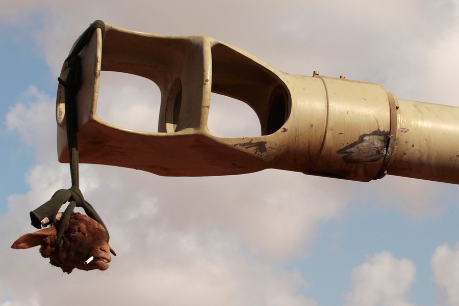 Read moreThe head of a goat is hung on the muzzle of a destroyed tank, belonging to forces loyal to Libyan leader Muammar Qaddafi, after an air strike by coalition forces along a road between Benghazi and Ajdabiyah March 20, 2011. #